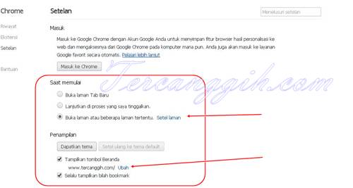 1. Langkah pertama periksa settingan di browser Google Chrome anda dulu, caranya masuk menu Option / Setelan yang ada di samping kanan browser anda. Lalu periksalah settingan Saat Memulai dan pada penampilan opsi Tampilkan tombol meranda untuk merubah url link apa yang akan pertama muncul saat kita membuka google chrome.