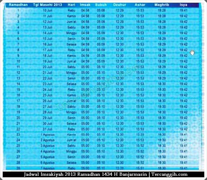 Untuk melihat versi rukyatulhilal.org Jadwal Imsakiya Banjarmasin dan kota lain seluruh wilayah Indonesia bisa dilihat di : Jadwal Puasa dan Waktu Shalat 2013 Ramadhan 1434 Hijriah. Semoga bermanfaat dan selamat berpuasa.