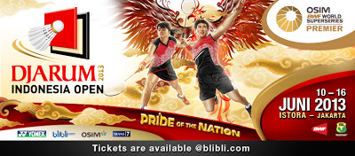 Indonesia Open 2013 - Turnamen bulutangkis Djarum Indonesia Open Super Series Premier (DIOSSP) sesuai jadwal Indonesia Open mulai digelar tanggal 10-16 Juni 2013 di Istora Senayan, Jakarta. sejumlah laga akan ditayangkan stasiun Trans 7 sebagai official broadcast. Tiket masuk bisa didapat di situs blibli.com.