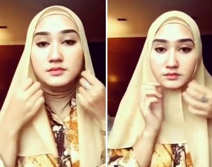 - Bawa hijab sebelah sisi kanan ke arah kiri dan tutupi telinga dengan ujung tersebut lalu pindahkan ke belakang bagian pundak. Tahapan tersebut juga diterapkan pada hijab sisi kiri terapi dengan arah yang berlawanan.